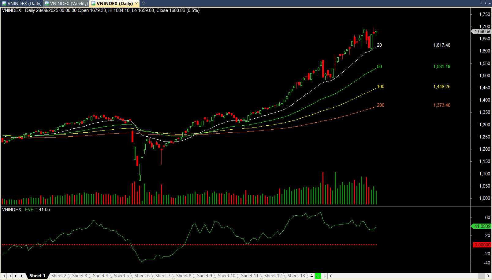 - Khi FVE > 0: Phe Mua đang kiểm soát cuộc chơi. Đường FVE càng dâng cao, áp lực mua càng mạnh mẽ, củng cố cho một xu hướng tăng giá.