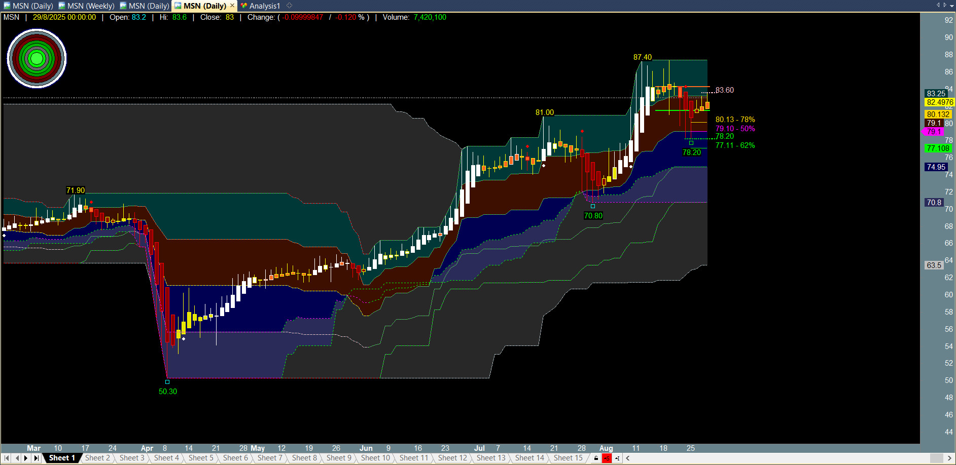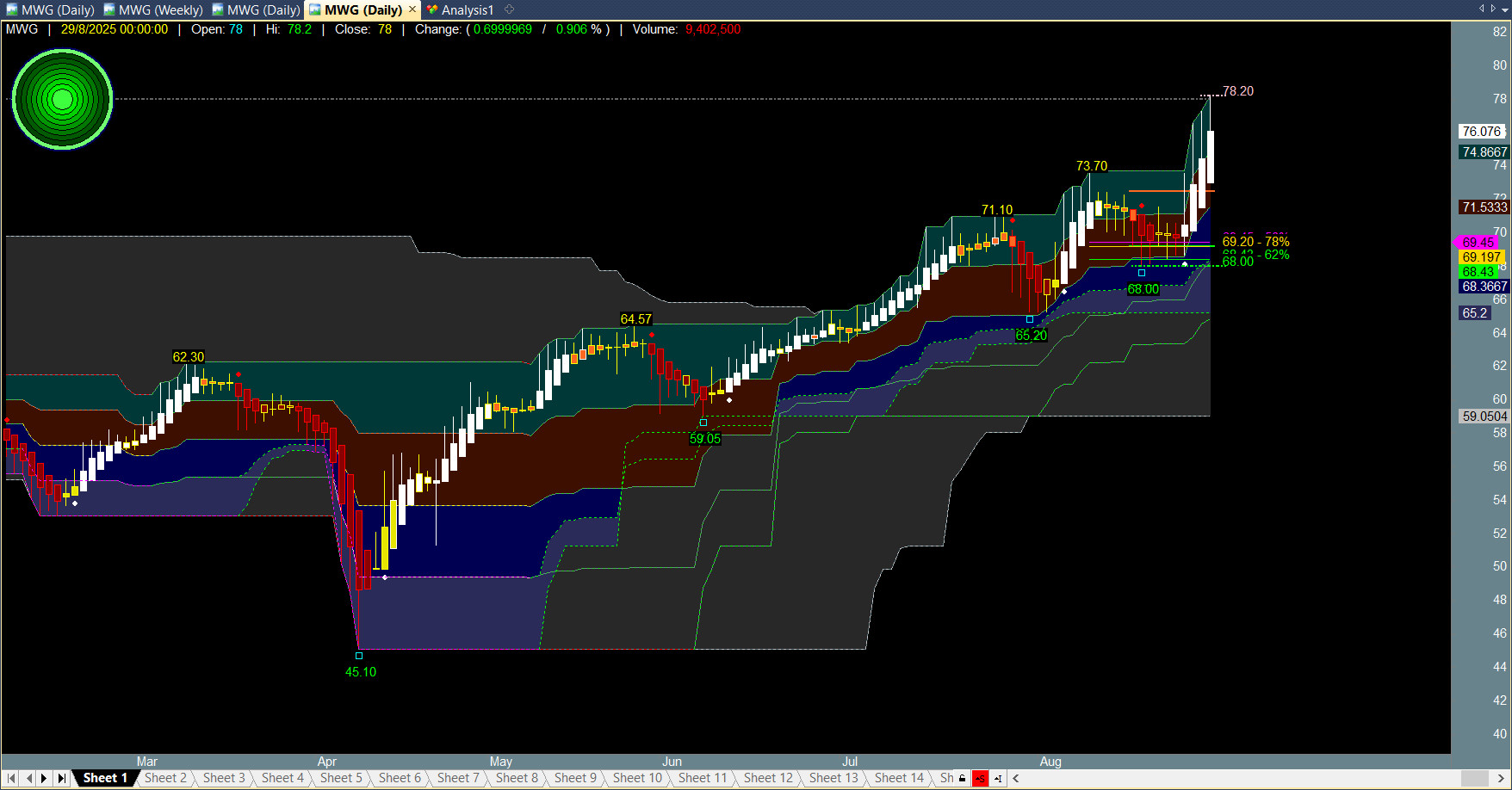 - Hệ Thống Mây Đa Lớp: Các dải mây màu sắc. Luôn ưu tiên giao dịch phía trên mây cho xu hướng tăng và dưới mây cho xu hướng giảm. Đây là các dòng hải lưu của bạn.