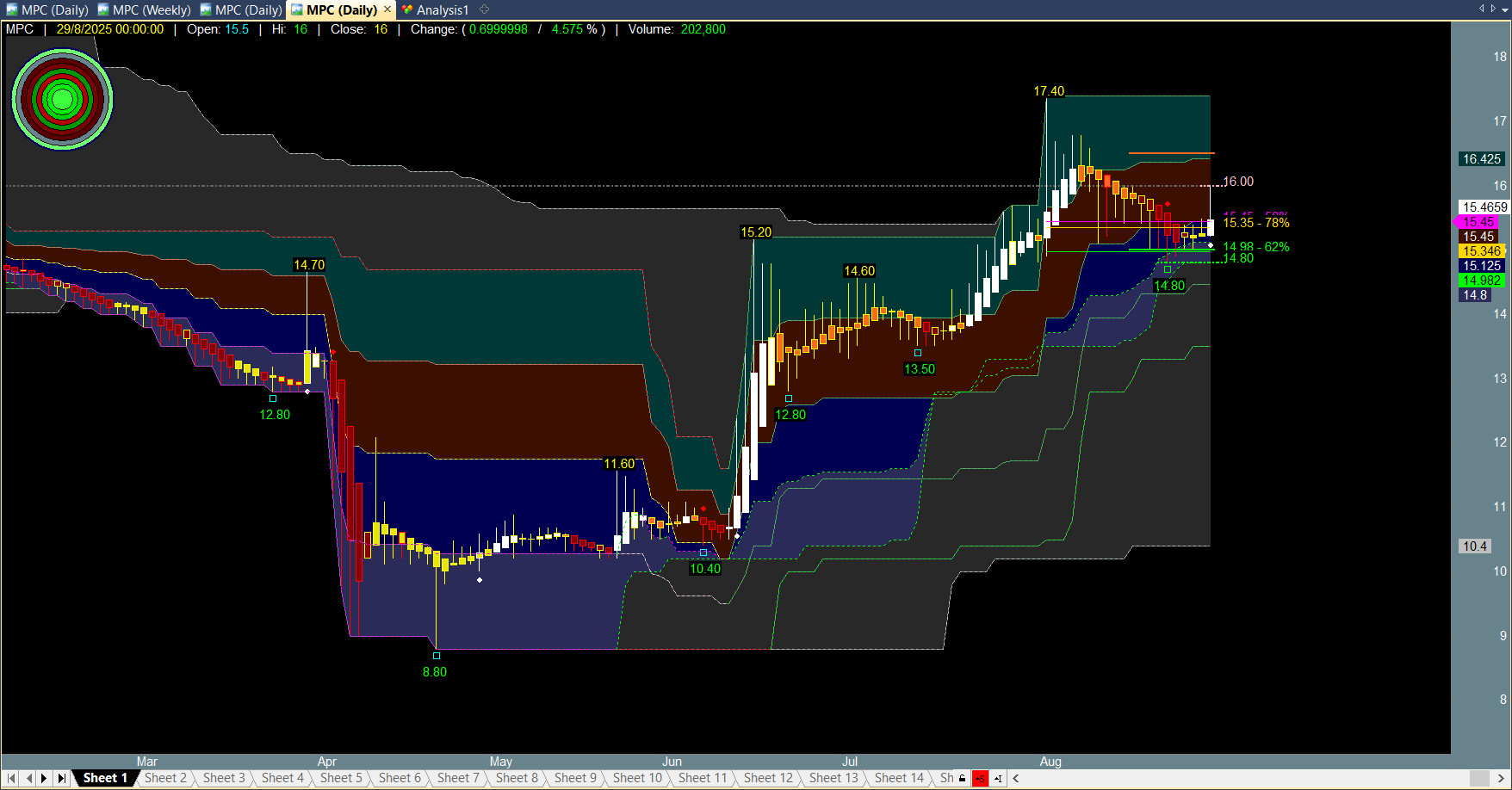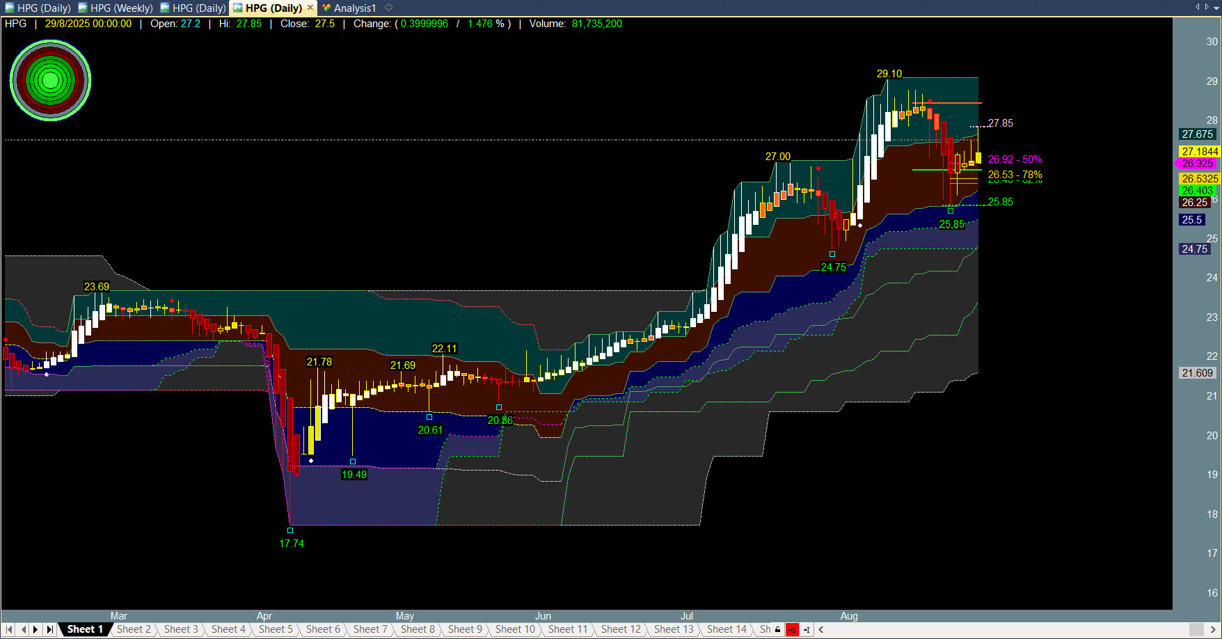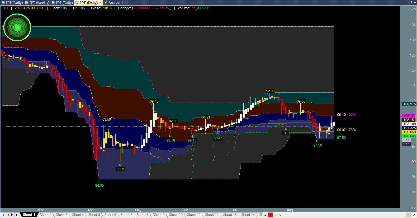 - Hệ Thống Dẫn Đường Pivot: Các đường xu hướng, kênh giá, và các mức Fibonacci được vẽ tự động. Đây là bản đồ chi tiết, đánh dấu các vùng cản và hỗ trợ quan trọng.