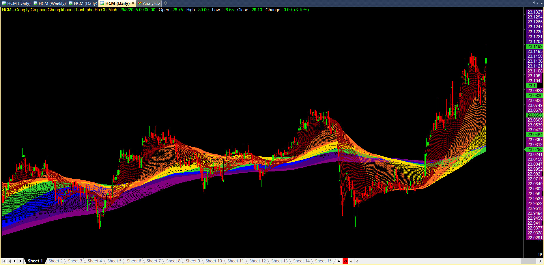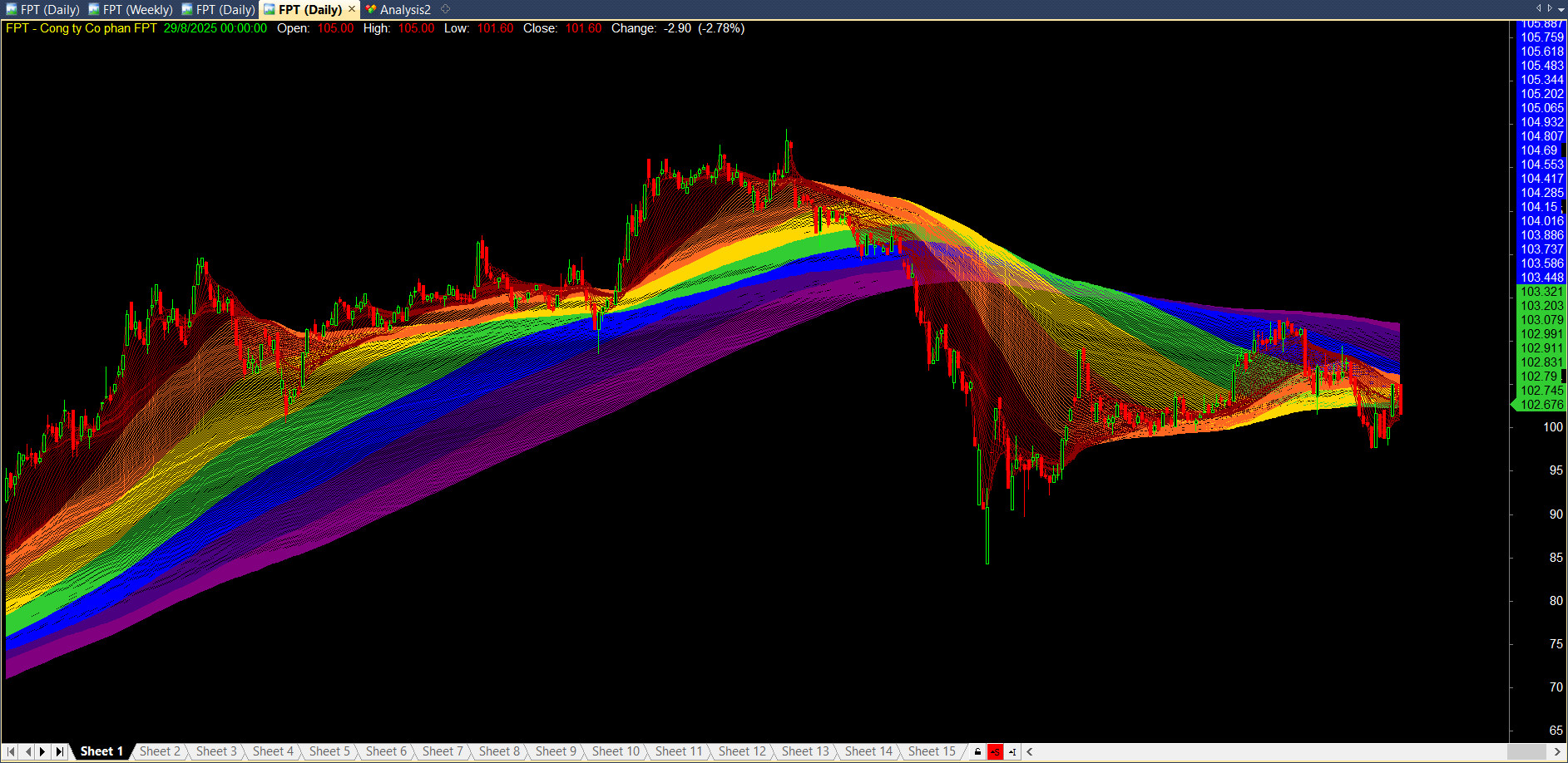 - Các lớp màu nóng (Đỏ, Cam, Vàng): Là các đường MA ngắn hạn, phản ứng nhanh với giá.